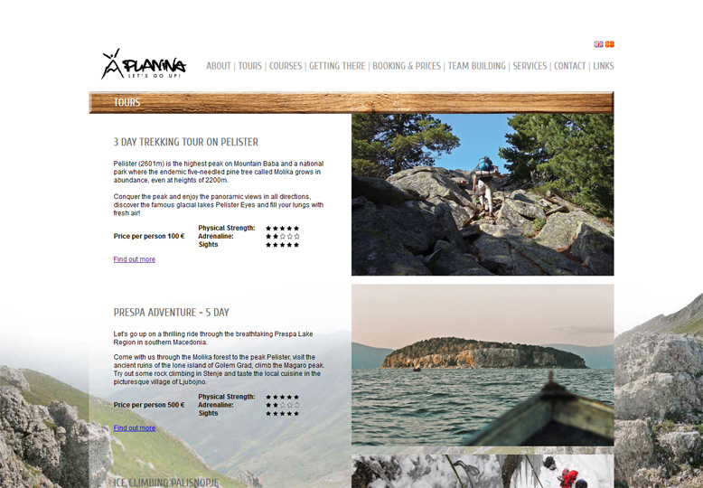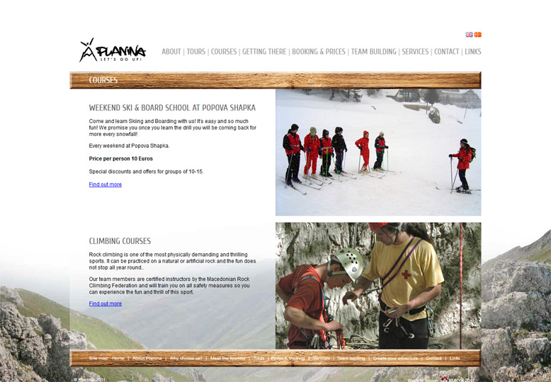The website was centered around the beautiful mountain landscapes, the adventurous spirit, safety and the professional experience of the team. The sections of the website were carefully organized: tours varied by season and level of difficulty, while giving information about the distinct qualities that each region offers (rock climbing, water sports, biking and hiking, etc.). Team building for companies, ski camps and other services were also offered as special services on the website.